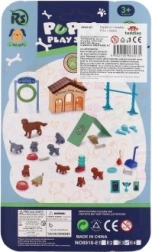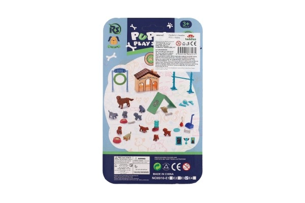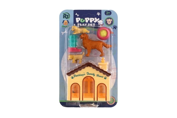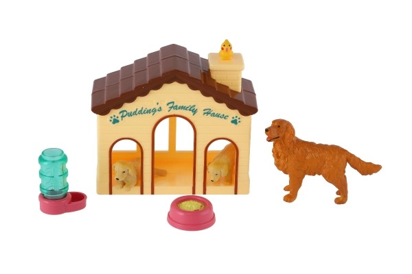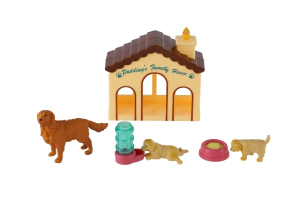 Включени са две кученца, възрастно куче, купичка за храна и поилка – всичко необходимо за реалистична игра.