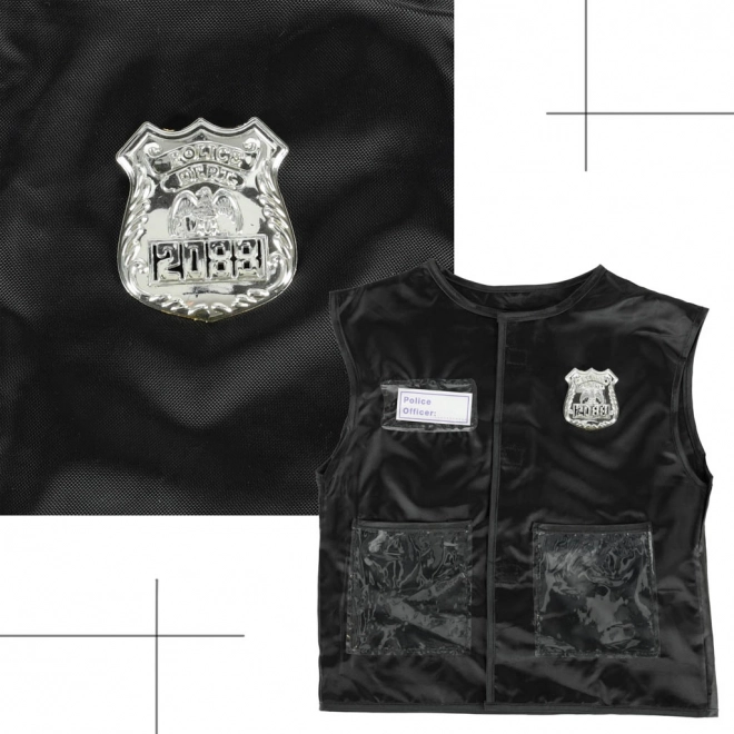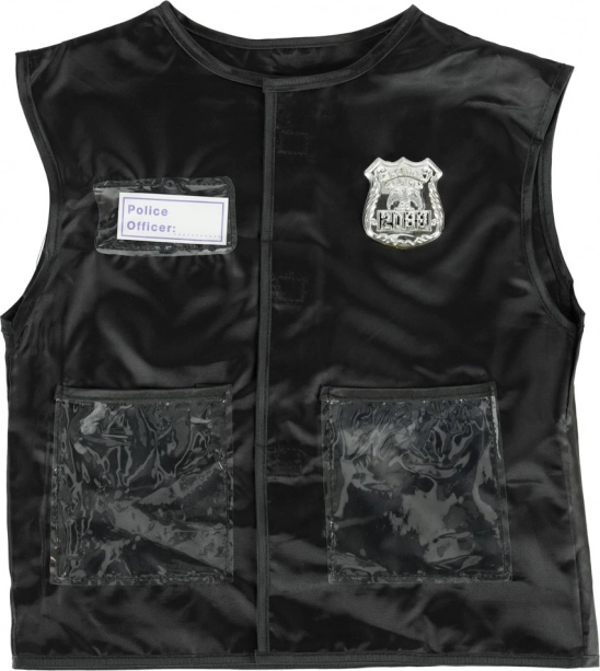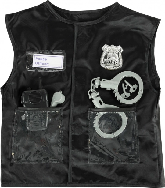 Елекът има прозрачни джобове, сребрист значка и нашивка „Police Officer“, което позволява на децата да се почувстват като истински полицай.
