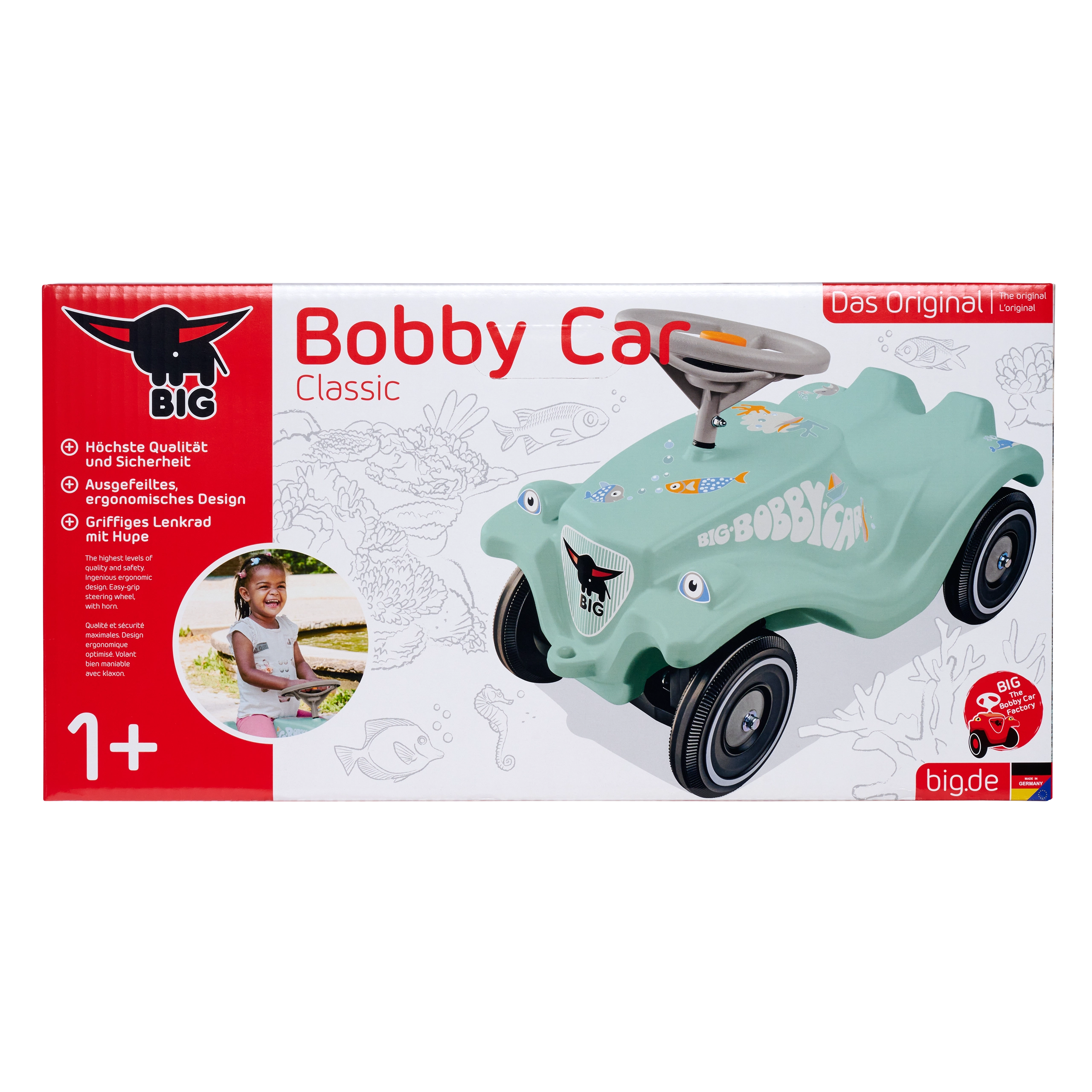 Количката за бутане BIG Bobby Car Classic Green Sea е любимата класика в нов привлекателен нюанс. Благодарение на здравата изработка и ергономичната форма е идеална за първите опити за каране на деца от 12 месеца. Воланът с клаксон добавя реализъм към играта, докато ниският център на тежестта осигурява стабилност и безопасност при каране.