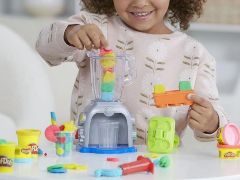 Открийте радостта от творчеството с Play-Doh кухненския миксер за смутита. Този забавен комплект позволява на деца от 3 години да се преструват на готвачи и да създават пъстри модели от тесто във формата на плодове и зеленчуци. След оформянето всичко се поставя в миксера, където се получават шарени „смутита“ за забавна игра.
