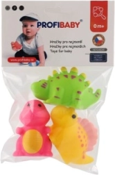 Забавен комплект от три гумени динозавъра за баня ще зарадва всяко дете. Весели цветове, мек материал и лесно стискане ги правят идеални играчки за ваната и басейна. Всеки динозавър при стискане пръска вода, стимулира сетивното възприятие и носи безопасно забавление още от раждането.