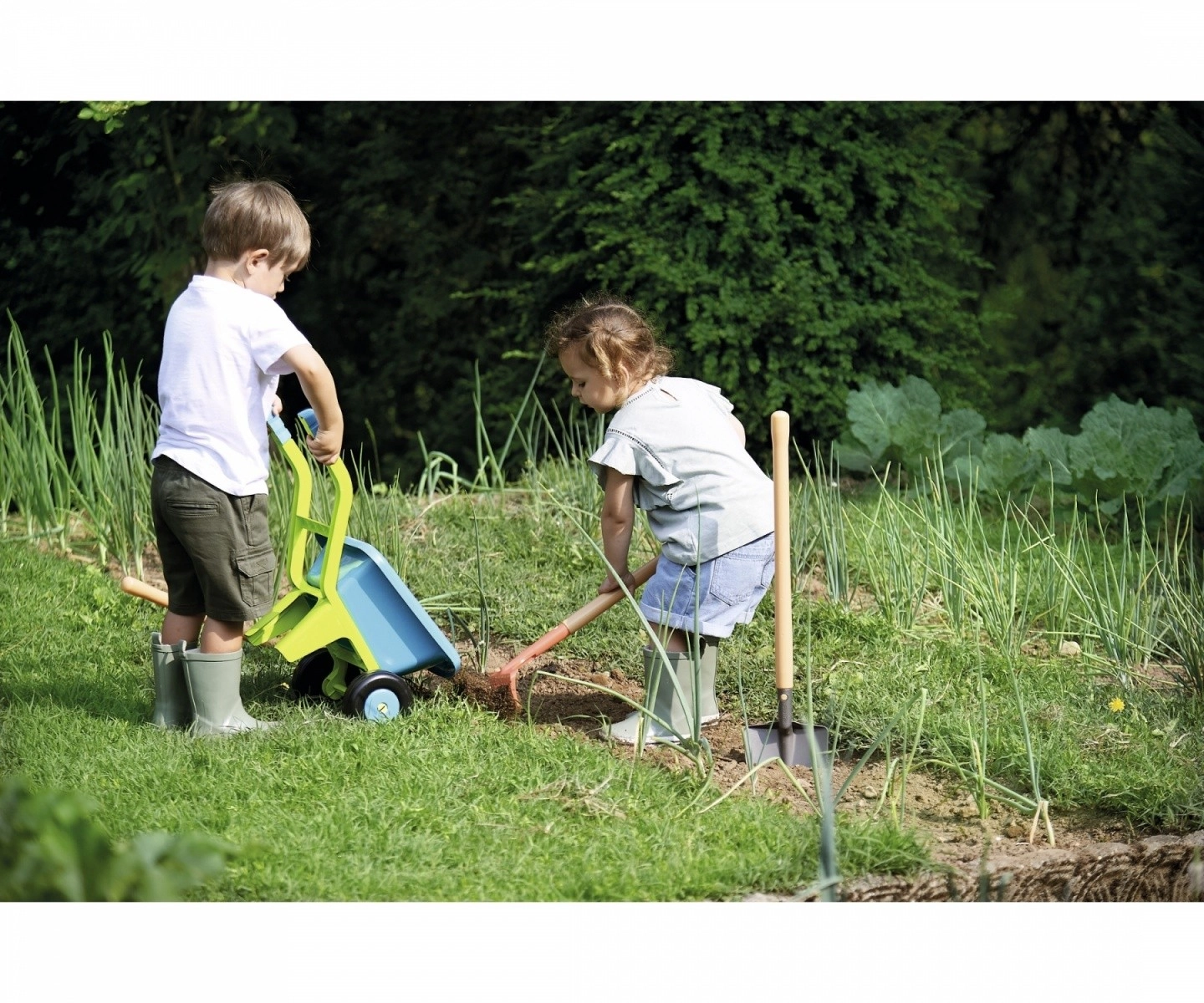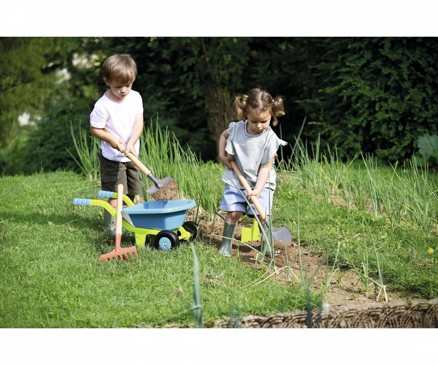 Комплектът съдържа всички необходими инструменти, като зелена лейка, червено пластмасово гребло и малка метална лопатка. Така децата могат да се наслаждават на креативна игра директно в градината и да развиват своите умения.