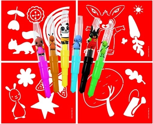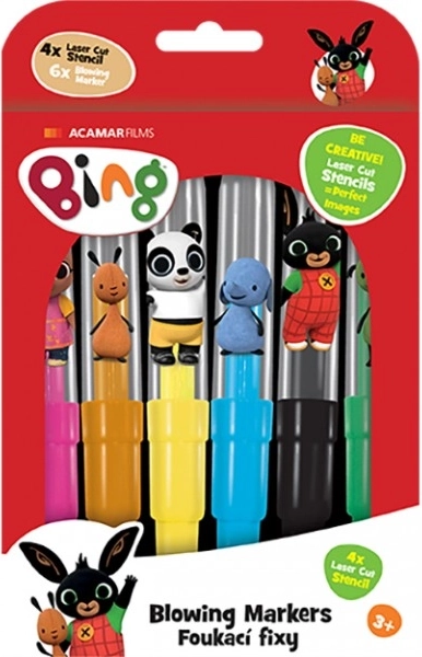 Комплектът фукани флумастери BING ще зарадва всички малки артисти. Шест пъстри цвята и тематични шаблони позволяват лесно създаване на оригинални картинки с любими герои. Просто духане през флумастера създава фини преливания и спрей ефекти без бъркотия.