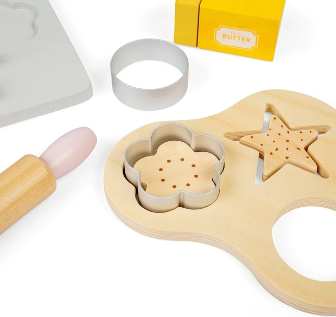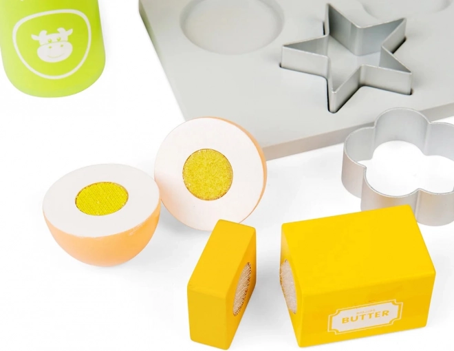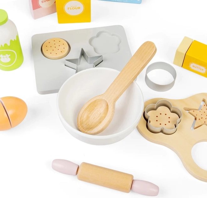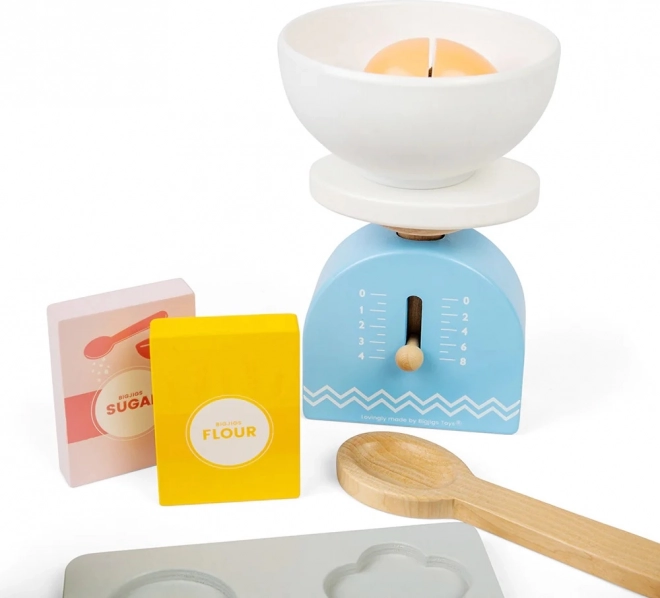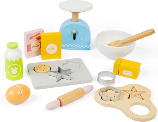 С този детски дървен комплект за печене можете да осигурите часове забавление, като същевременно стимулирате детското въображение. Комплектът включва дървена тава за печене, везна, формички, точилка, купа, масло, яйца, брашно, захар и мляко. Безопасността в кухнята се усвоява по игрив и забавен начин.