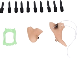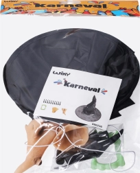 Пълен вещерски комплект за всяко парти, карнавал и Хелоуин. Съдържа голяма шапка, брадичка и нос на ластик, 10 поставящи се пръста с нокти и зъби, така че лесно да създадете автентична вещерска визия за няколко минути.