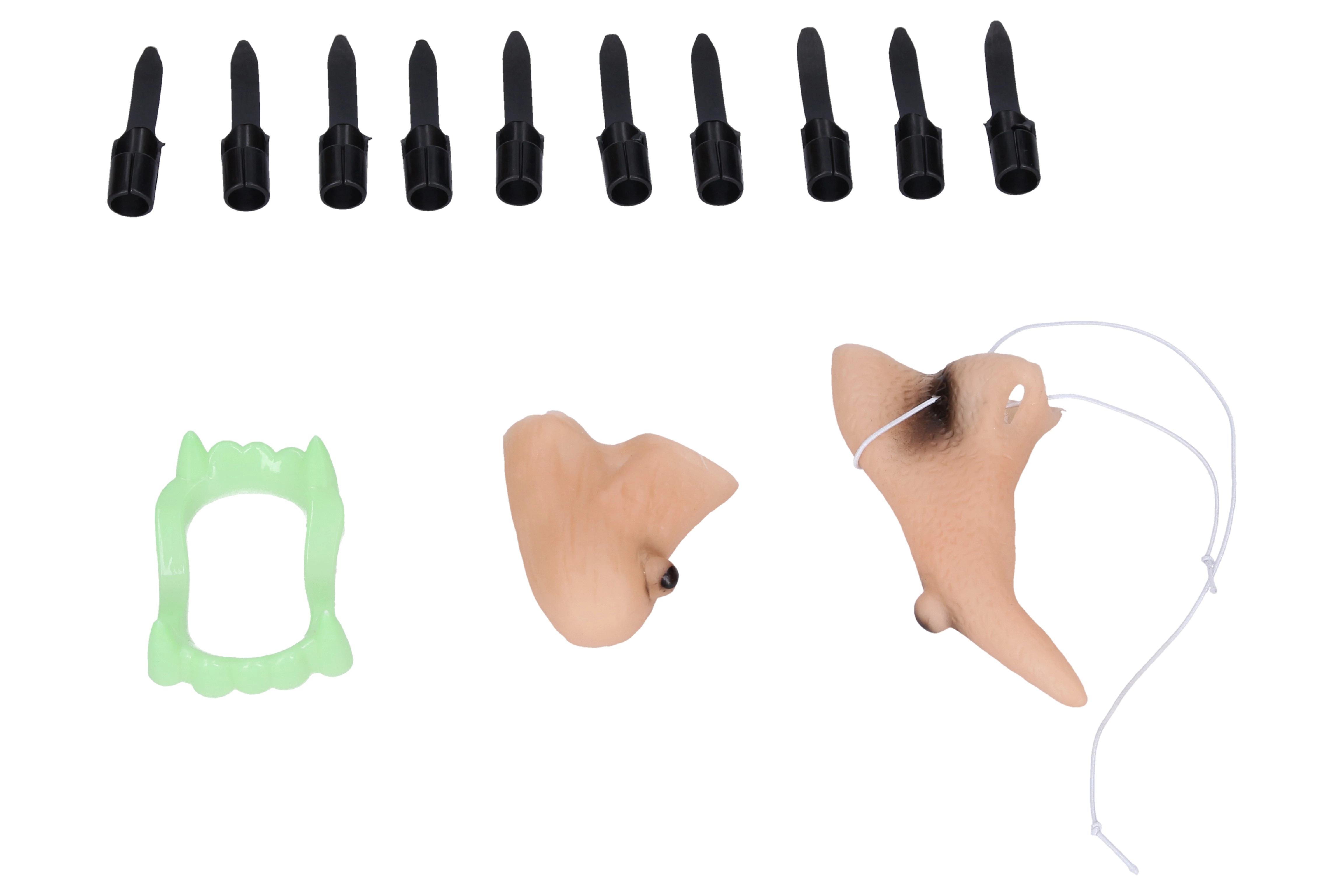 - Брадичка на ластик, нос на ластик, 10 поставящи се пръста с нокти, зъби, голяма вещерска шапка