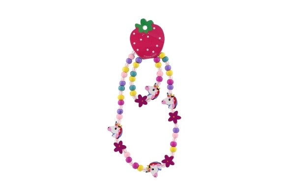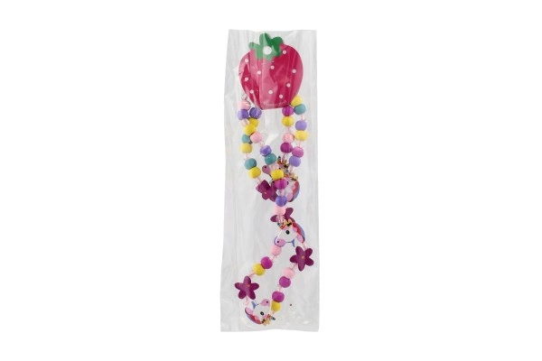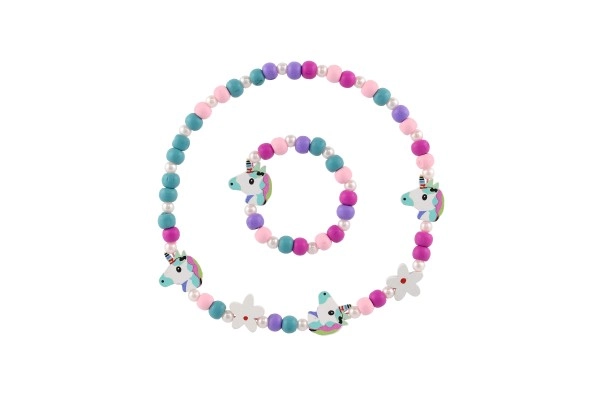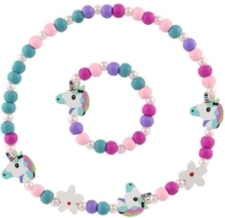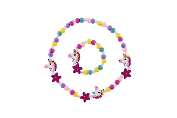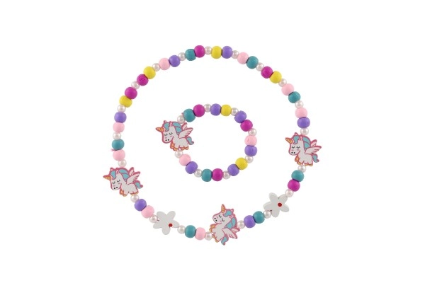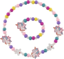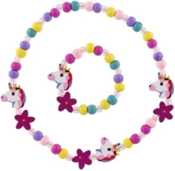 Този игрив детски комплект бижута – колие и гривна – очарова с веселите си цветове, мъниста и висулки с мотиви на еднорози и цветя. Комбинацията от дърво и пластмаса е лека, приятна на допир и подходяща за ежедневна употреба.