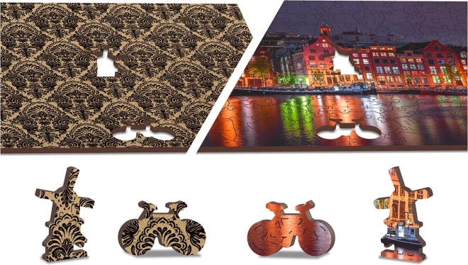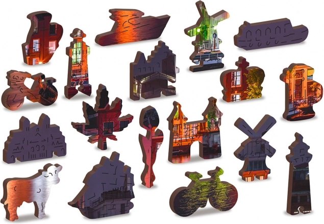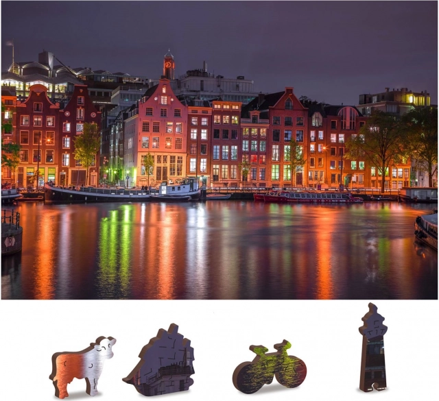Този уникален дървен пъзел ще зарадва всеки любител на подреждането. Благодарение на лазерното изрязване пъзелът има гладки ръбове, които лесно се съединяват. Съдържа общо 150 елемента, от които 30 са с уникални форми като животни или известни сгради, добавящи образователен елемент и визуална естетика. Пъзелът е проектиран като 2 в 1, което означава, че можете да го подреждате както по изтънчения нощен мотив на Амстердам, така и по модела на задната страна.