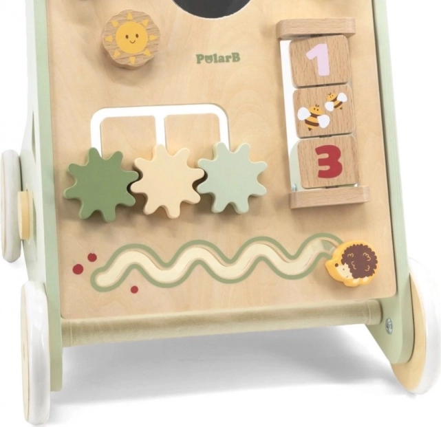 Дървената бутална проходилка PolarB Viga е проектирана да съпровожда безопасно децата в първите им стъпки и едновременно да ги мотивира да откриват. Предният панел предлага множество активности – от въртящи се зъбни колела през плъзгащи лабиринти до сортиране на форми и огледалце, които естествено развиват сетивата и логическото мислене.
