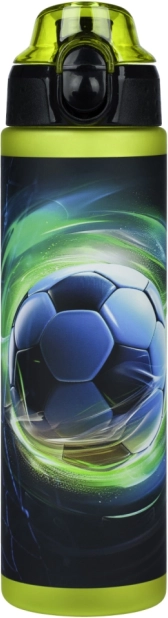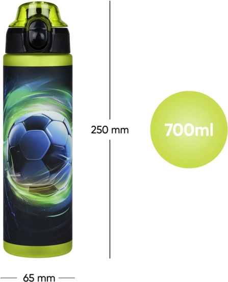 Стилен футболен принт и странична ръска за контрол на хидратацията. Идеална за училище, тренировки и пътувания.