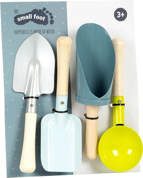 Детският комплект лопатки Small Foot съдържа всичко необходимо за малките строители и градинари: ръчна лопатка, лопатка с загребвач, лопатка за смет и лопатка за въглища. Здравите метални глави и гладките дървени дръжки осигуряват дълъг живот и удобно държане дори при по-продължителна игра.