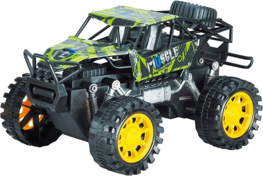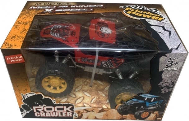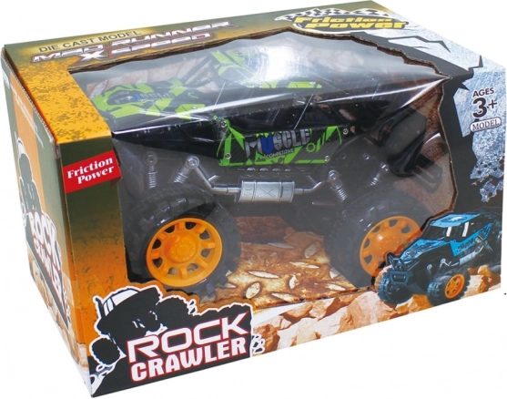 Този издръжлив модел rock crawler е създаден за приключения. Благодарение на фрикционния привод е достатъчно да дръпнете количката по повърхността и да я пуснете – тя веднага потегля напред. Големите офроуд колела и повдигнатото окачване преодоляват препятствия, килими и външни настилки.