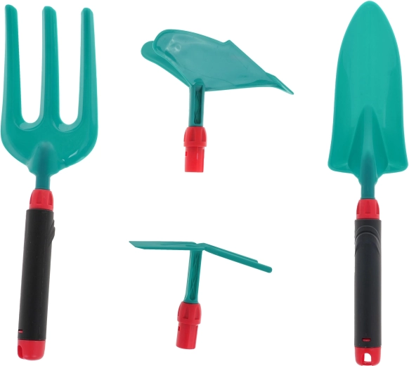Открийте забавленията в градината с този безопасен детски комплект градински инструменти за деца от 3 години. Комплектът включва 4 леки инструмента без остри ръбове и с сваляеми дръжки за лесно съхранение. Универсалната тюркоазено–червена цветова комбинация е подходяща за момчета и момичета, а ергономичните форми пасват на малките детски ръце.