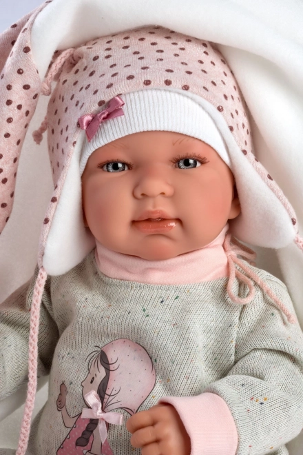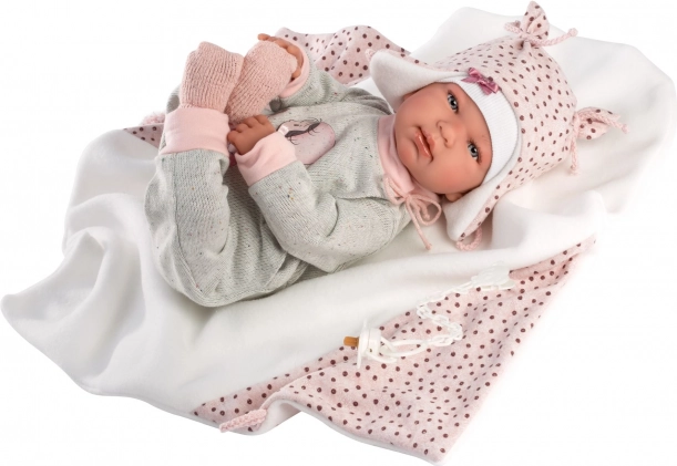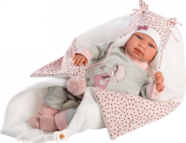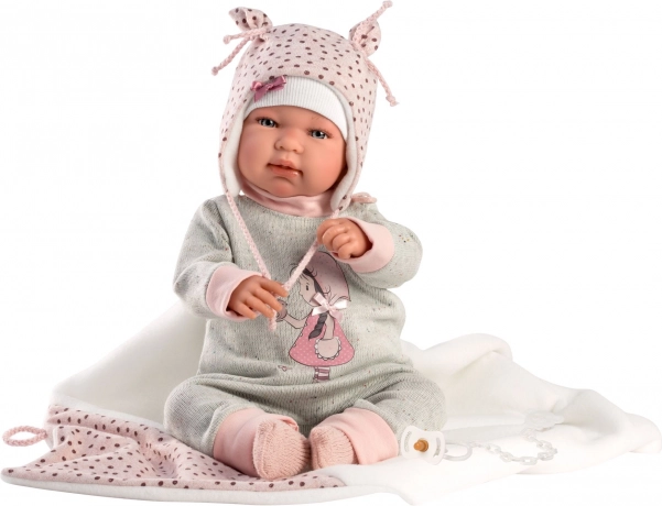 Част от комплекта е стилно одеялце с помпон за връзване, което завършва визията на куклата и прави играта по приспиване по‑приятна.