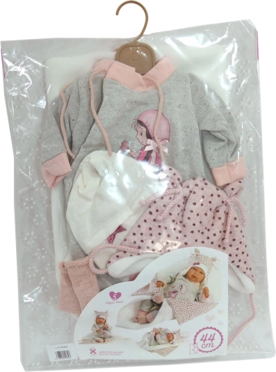 Подарете на куклата си нов шикозен аутфит, който насърчава въображението и радостта от играта. Този 4‑частов комплект за кукли NEW BORN (43–44 см) съчетава удобство и стил – съгласувани панталонки и топ, допълнени от меко одеялце с помпон за връзване и други сладки аксесоари. Ръчната изработка в Испания гарантира прецизни детайли и приятни материали, подходящи за детска игра.