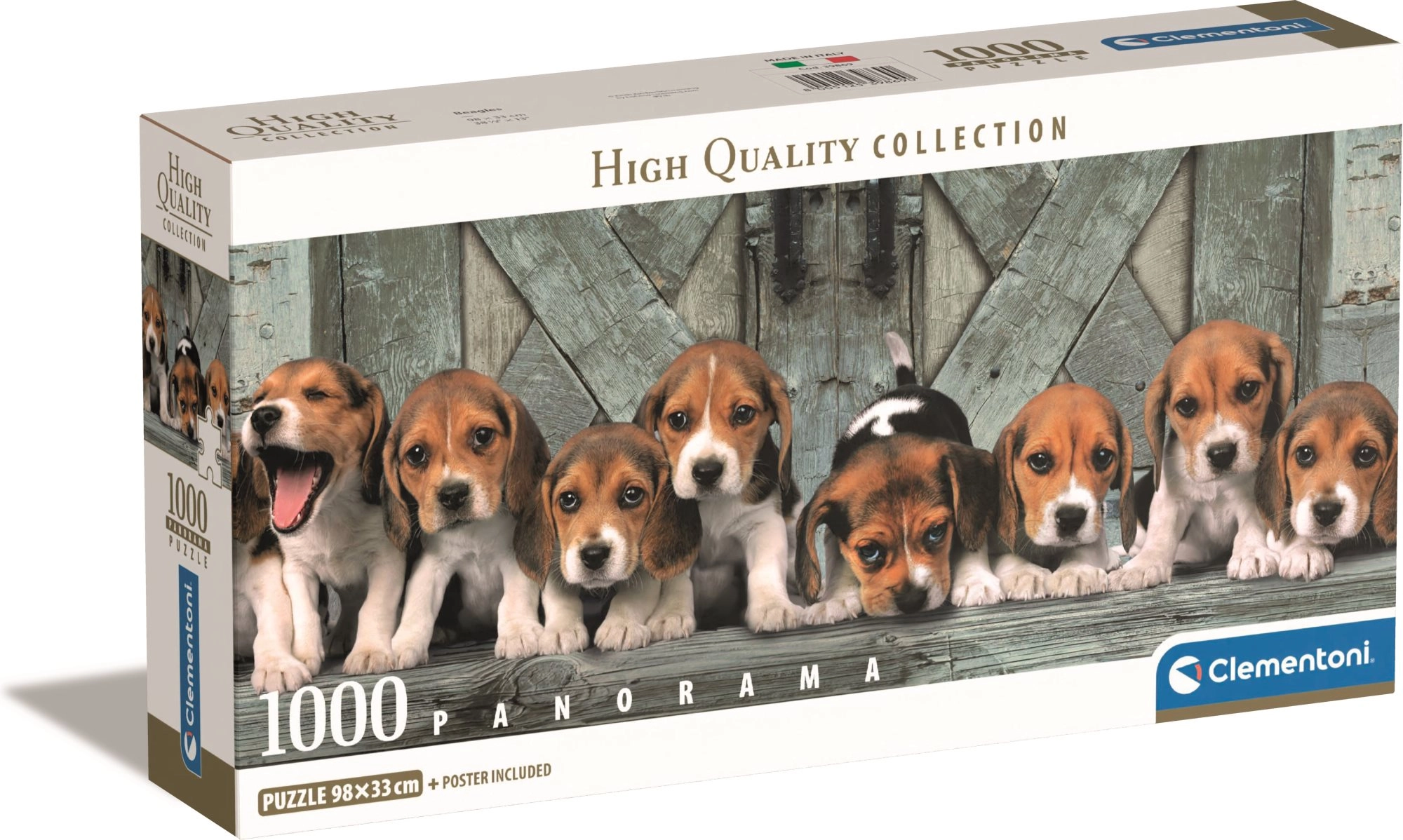 Насладете се на релакс с панорамен пъзел от 1000 части с мотив куче Бигъл в екологично щадяща компактна опаковка. Благодарение на качествения дебел картон и прецизния печат пъзелът е издръжлив, с вярно възпроизведени цветове и стои стабилно сглобен. Готовото изображение е с размер 98 × 33 cm.
