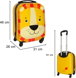 Очарователен детски куфар с мотив на лъв, идеален като ръчен багаж за малки пътешественици. Има здрав пластмасов твърд корпус, четири колела за лесно водене и телескопична дръжка. Вътре предлага две отделения – джоб с цип и част с кръстосани ластични колани – за удобното подреждане на дрехи и любими играчки.