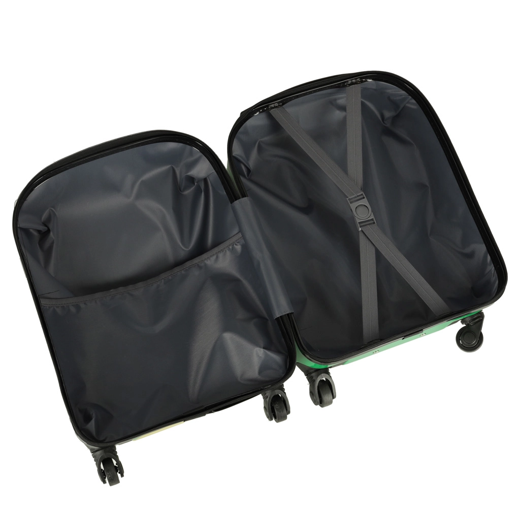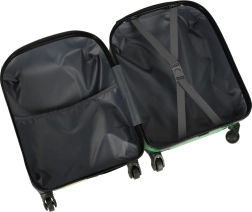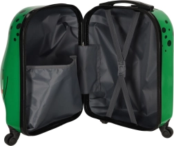Интериорът е разделен на две отделения – едното с мрежест джоб, а другото с кръстосани колани за сигурно фиксиране на съдържанието. Четирите въртящи се колелца и изтеглящата се дръжка позволяват на децата лесно да водят куфара.