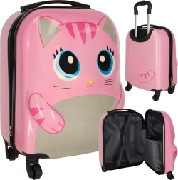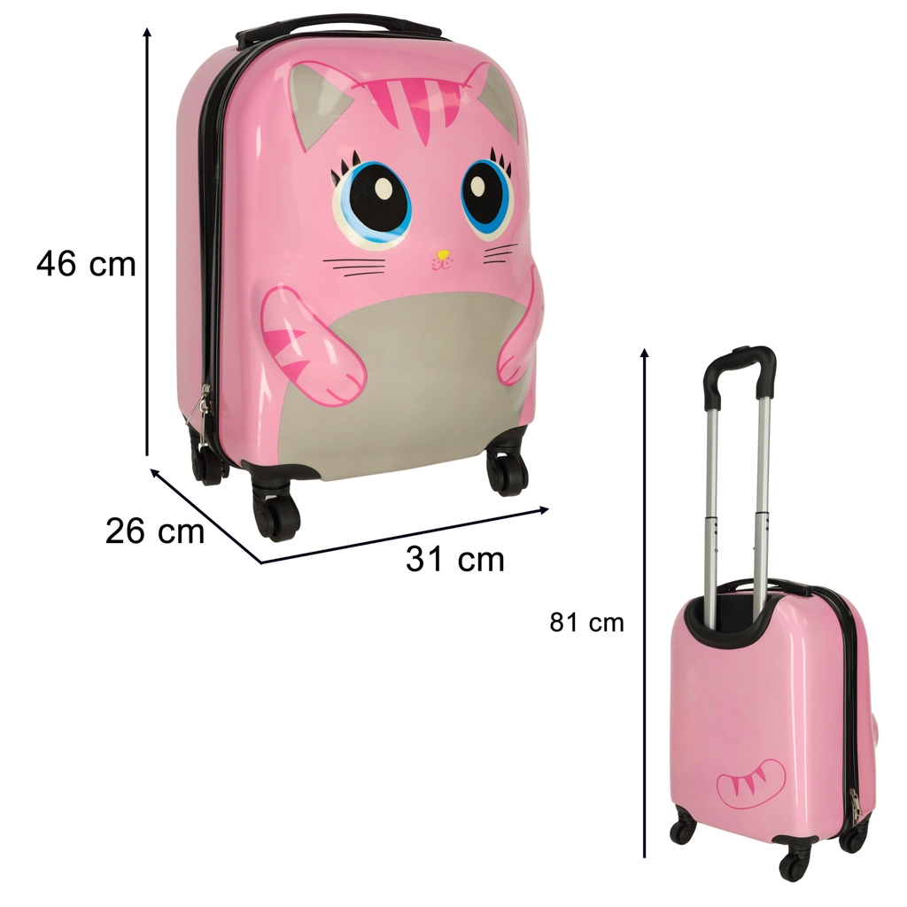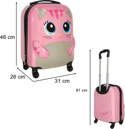 Стилен и функционален детски куфар с очарователен котешки дизайн, идеален за екскурзии, ваканции и уикенд посещения при баба и дядо. Лекият и здрав корпус защитава съдържанието, а плавно движещите се 4 колелца и изтеглящата се телескопична дръжка улесняват управлението дори за по-малки деца.
