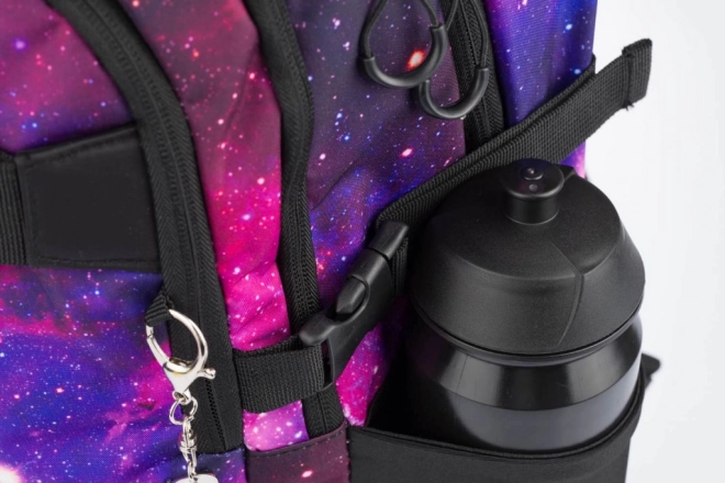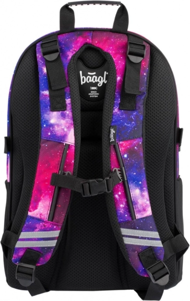 Открийте перфектната комбинация от функционалност и стил. Училищният сет BAAGL Skate Galaxy предлага издръжлива раница с три отделения, органайзер и подплатен джоб за 15" лаптоп или таблет. Ергономично оформен гръб, напълно регулируеми раменни, гръден и странични компресионни колани осигуряват здравословно и удобно носене през целия ден. Предните ленти служат за закрепване на скейтборд, страничните еластични джобове побират бутилка за вода, а светлоотразителните елементи повишават видимостта.
