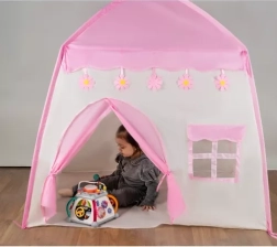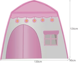 Стилна палатка за деца в розово-бяла комбинация предлага три прозорчета от мрежа и удобен вход, което я прави идеална за четене, игра и подреждане на любими играчки. Благодарение на компактните размери 126 × 130 × 90 cm е подходяща за детската стая и може да се вземе и на вилата или терасата.