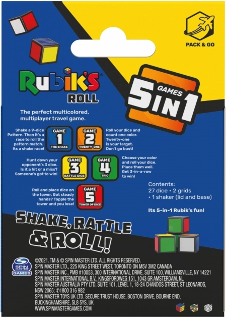 Rubik Roll е преносима игра, която включва 27 зара, шейкър и две решетки. Тази динамична игра включва пет игри: Тряскач, Двайсет и едно, Бойни зарове, Трио и Кулата от зарове, които комбинират различни умения като броене и стратегическо подреждане на заровете.