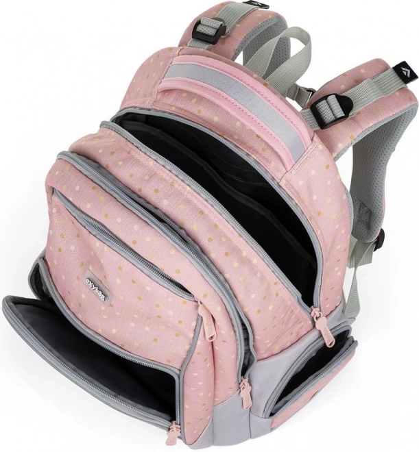 Ученическата раница OXY GO в нежeн дизайн с мотив на пеперуди впечатлява не само с визия, но и с обмислена ергономия. Благодарение на дишащия гръб и регулируемите раменни презрамки осигурява комфорт при целодневно носене и подпомага правилната стойка. Ниското тегло от 0,99 kg и светлоотразителните елементи повишават безопасността по пътя към училище.