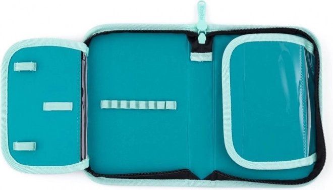 Вътре ще откриете две просторни отделения за учебници и тетрадки, преден джоб за кутия за закуска и по-малко джобче за дребни вещи – и двете с цип. Отстрани има отворен джоб за бутилка и малък джоб с цип за бърз достъп. Здравото дъно предпазва съдържанието от замърсяване и предотвратява протичане на течности. Част от комплекта е също торба за спорт от 100% полиестер със затягане с връзки и едноетажен несесер с два капака и 25 ластика (без пълнеж), с прозрачна вложка за разписание.