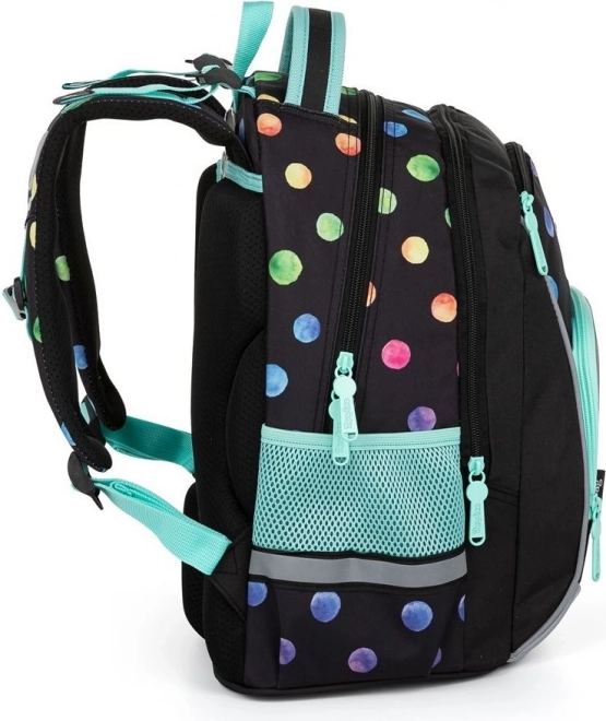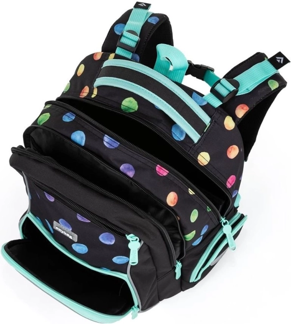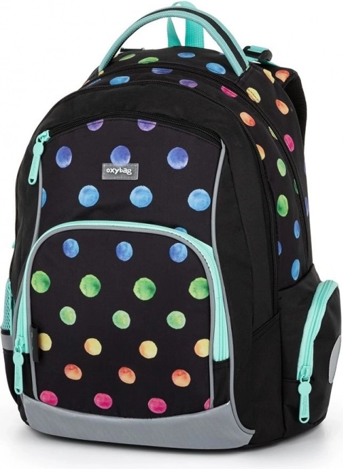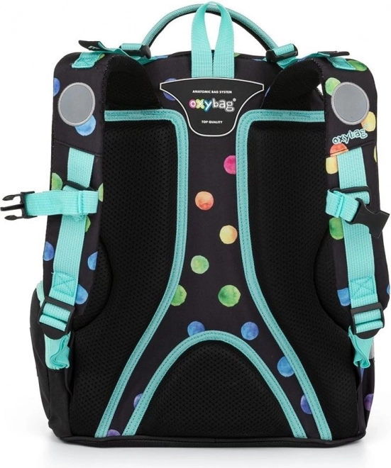 Училищният комплект Oxybag OXY GO Dots е проектиран за деца с ръст от 125 см и предлага идеална комбинация от комфорт, издръжливост и атрактивен дизайн с многоцветни точки. Раницата тежи само 0,99 кг, има здрава и дишаща задна част и регулируеми раменни презрамки за здравословно и удобно носене. Благодарение на светлоотразителните елементи детето е по-видимо и при намалена осветеност.