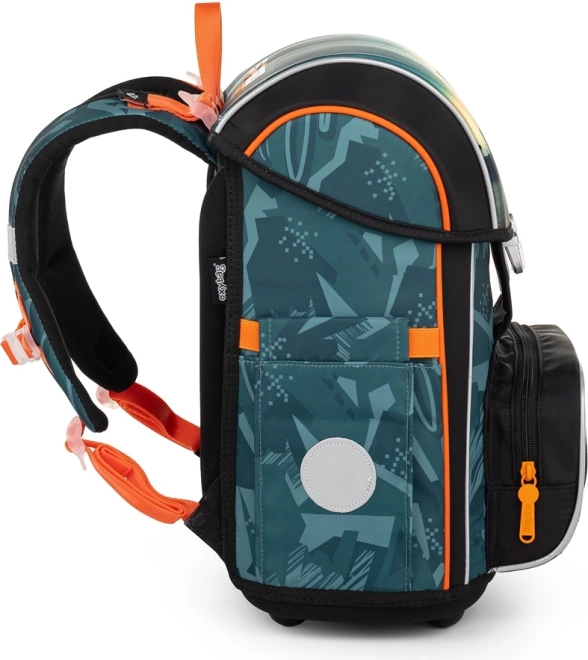 Училищният комплект с мотив на състезателна кола е създаден за деца още от първи клас. Включва училищна раница с анатомично оформен гръб, която предлага удобно носене благодарение на омекотените и дишащи раменни презрамки. Раницата е не само лека, но и безопасна благодарение на светлоотразителните елементи. Предният джоб е идеален за кутия за сандвичи, а страничните джобове предлагат достатъчно място за допълнителни учебни принадлежности.