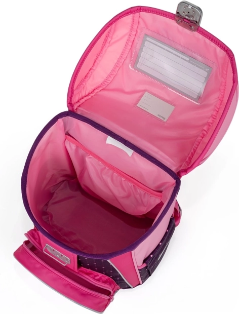 Главното отделение с вътрешен джоб, етикет за име и учебна програма позволява ефективна организация на учебните принадлежности. Предният и страничните джобове осигуряват място за кутия за сандвичи и други аксесоари.