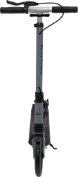 За безопасност тротинетката е оборудвана с двоен спирачен механизъм – ръчна дискова спирачка отзад и крачна спирачка на калника. Тристепенното регулиране на височината на кормилото (85–99 cm) се адаптира към водачи с различен ръст, а ергономичните гумени ръкохватки осигуряват удобство и при по-дълги разстояния.