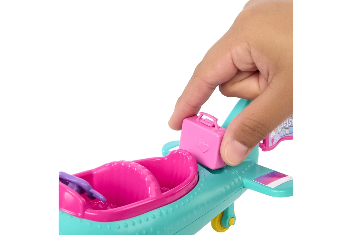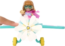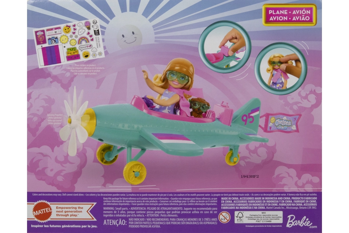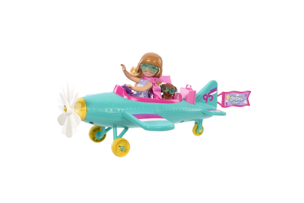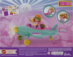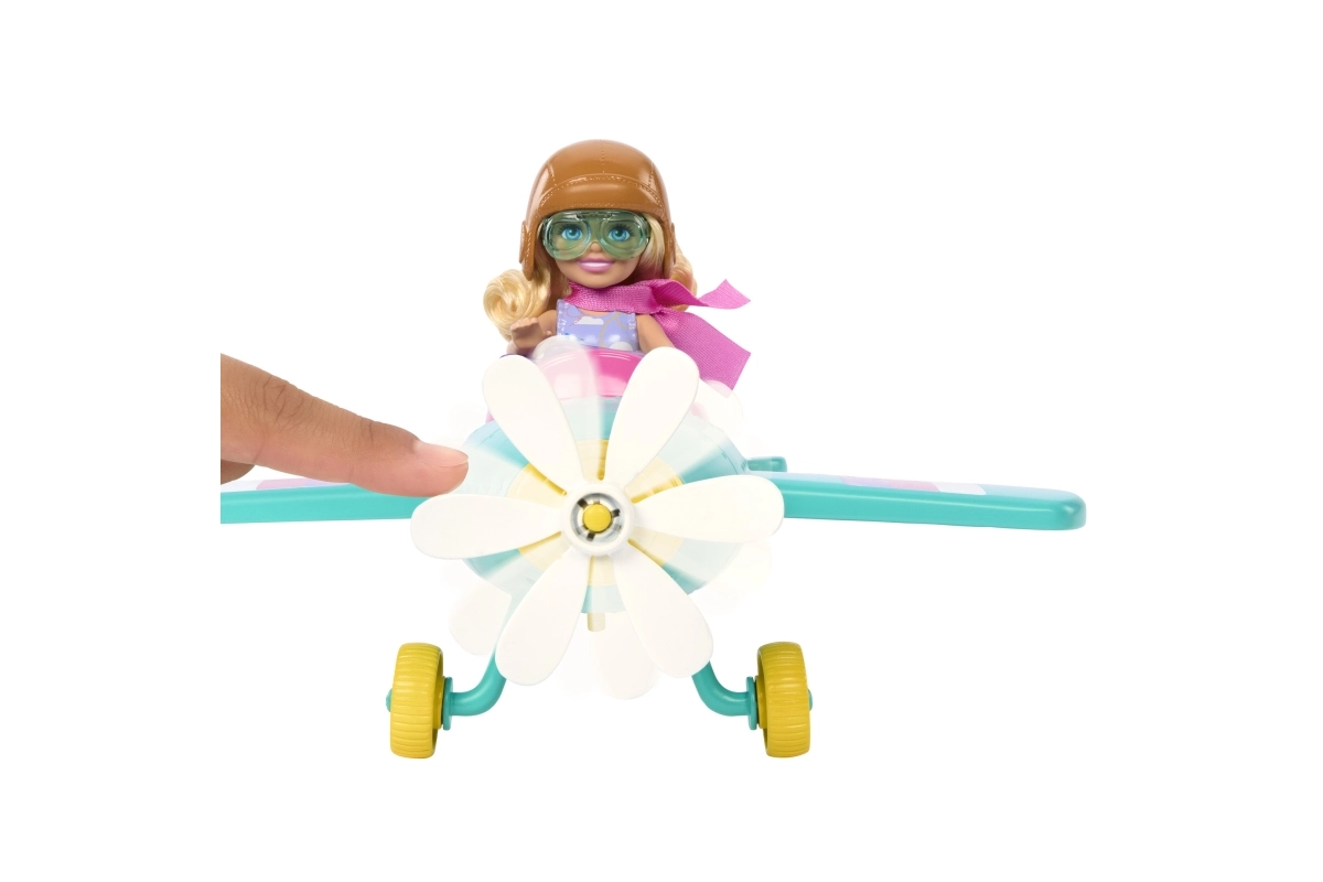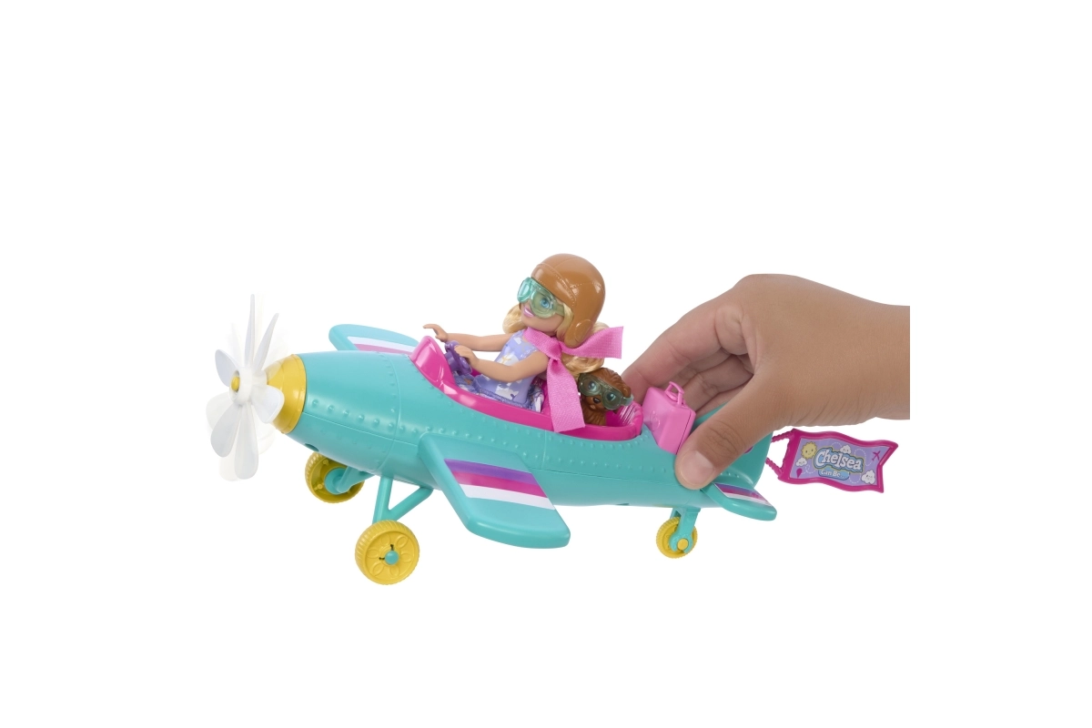 С комплекта Barbie Chelsea Can Be децата могат да мечтаят на едро. Малката пилотка CHELSEA сяда в двуместния самолет в ярки цветове, докато вярното кученце се качва на борда. Въртящата се цветна перка, свободно въртящите се колела и възможността за закрепване на флагчето на Chelsea превръщат всяко возене в полет, пълен с въображение.