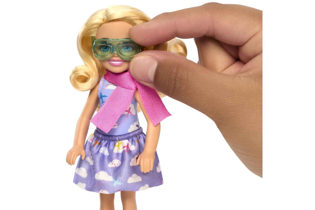 Куклата е облечена в сладка рокля с облачков принт, носи стилен розов шал и защитни очила. Аксесоарите – куфар, стикери и очила за куклата и кученцето – издигат играта до тематични мисии, пътешествия и разказване на собствени истории. Идеален подарък за деца от 3 години, които обичат самолети, пътувания и света на BARBIE и CHELSEA.