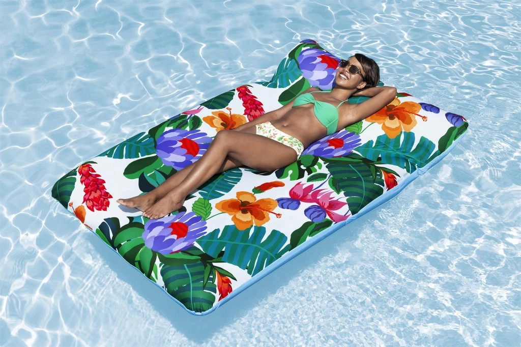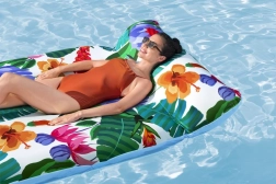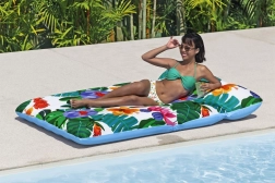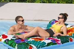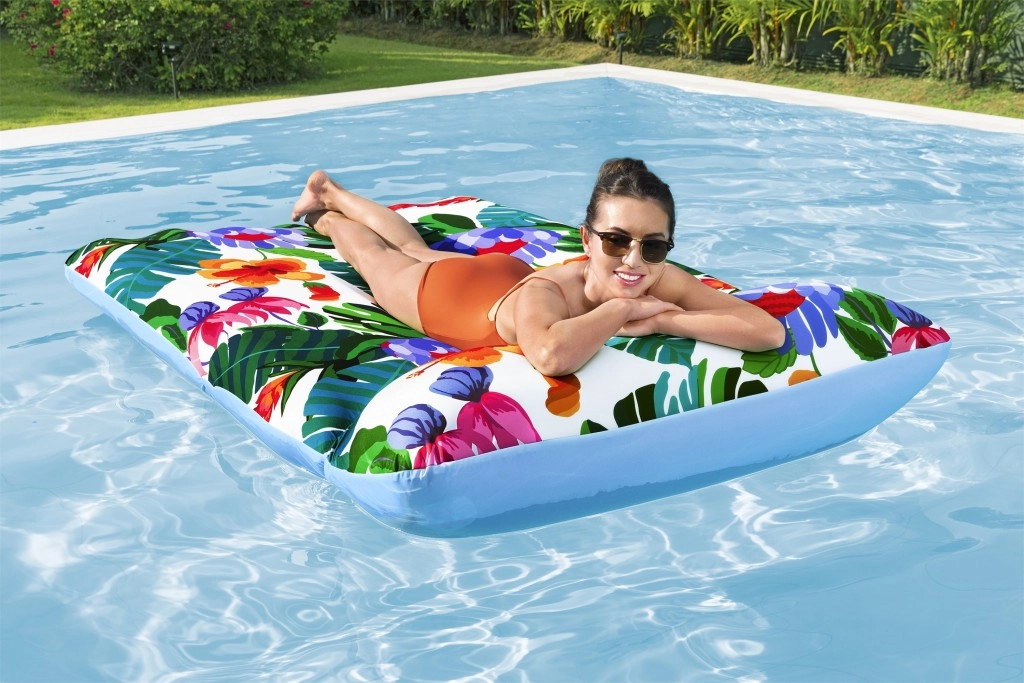 Насладете се на лятото във водата с удобния надуваем шезлонг с пераем калъф. Благодарение на размерите 200 × 123 cm предлага достатъчно място за релакс, меката текстилна тапицерия е приятна на допир и може лесно да се свали и изпере в пералня. Материята с защита UPF 50+ предпазва цветовете от слънцето, здравата и устойчива конструкция осигурява дълъг живот, а клапаните за бързо изпускане улесняват опаковането. Максимално натоварване 90 kg и идеален за лица от 14 години нагоре.