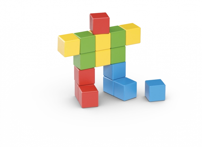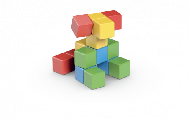 От 16-те кубчета ще създадете лесни човечета, животни и фантастични форми. Играта естествено развива въображението и логическото мислене.