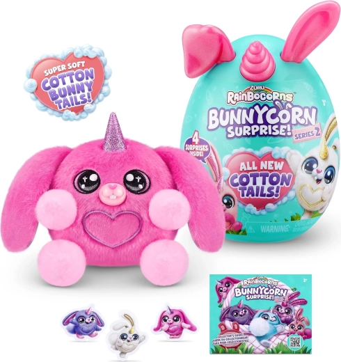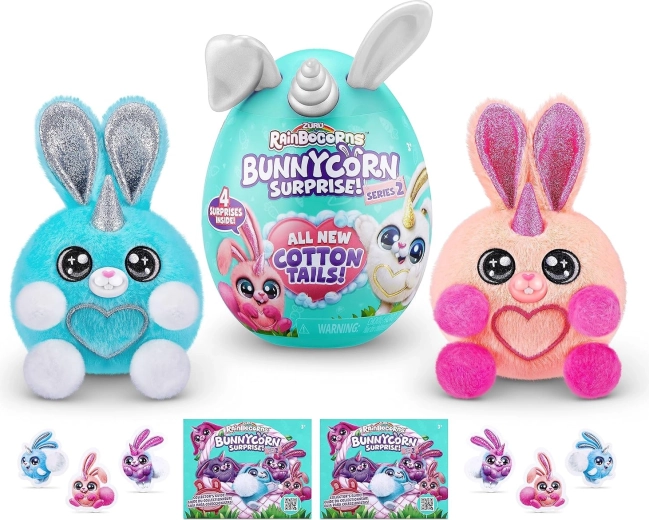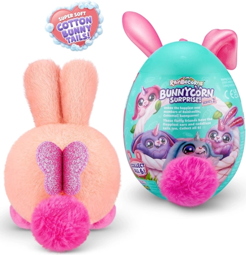 Малко, но вълшебно – зайчето Boo‑Boocorn от серията RAINBOCORNS носи на децата радост от изненадите и меко гушкане. Във всяко яйчице ще намерите плюшено зайче с блестящи ушички, пухкава опашка и други дребни аксесоари за игра и колекциониране.
