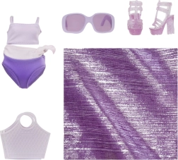Аксесоарите включват лилаво облекло, слънчеви очила, обувки и малка чантичка, което позволява различни модни вариации и теми като плаж или лято.