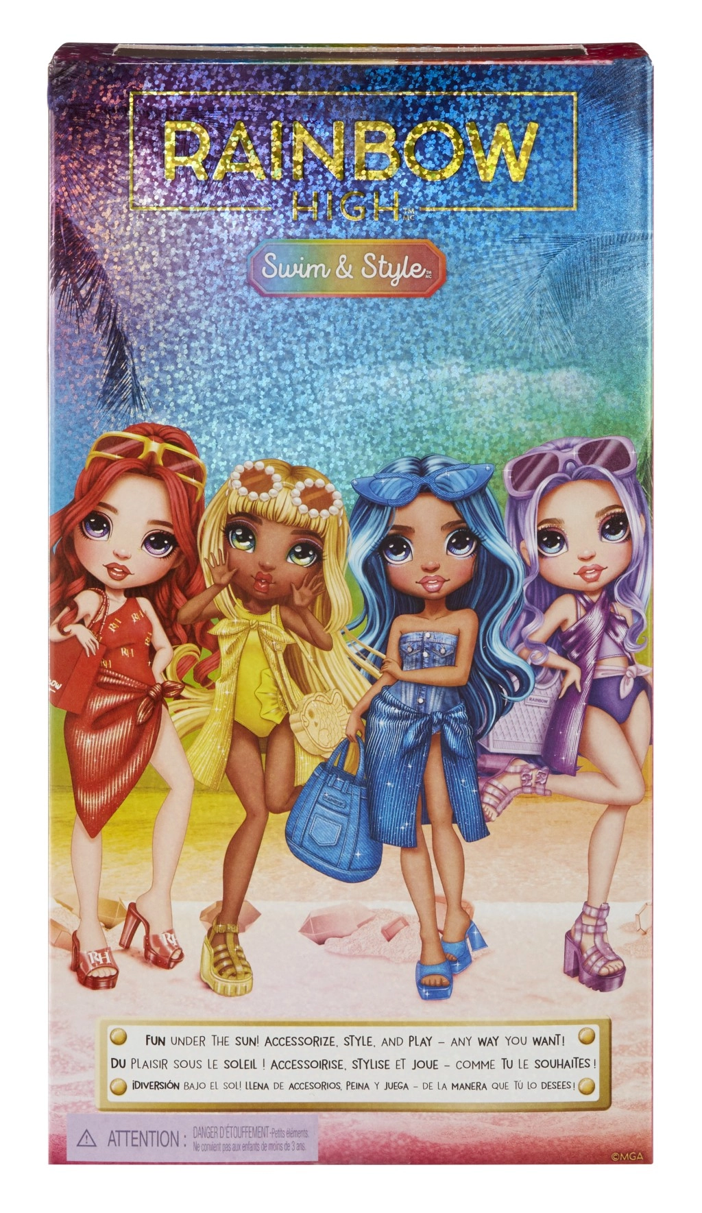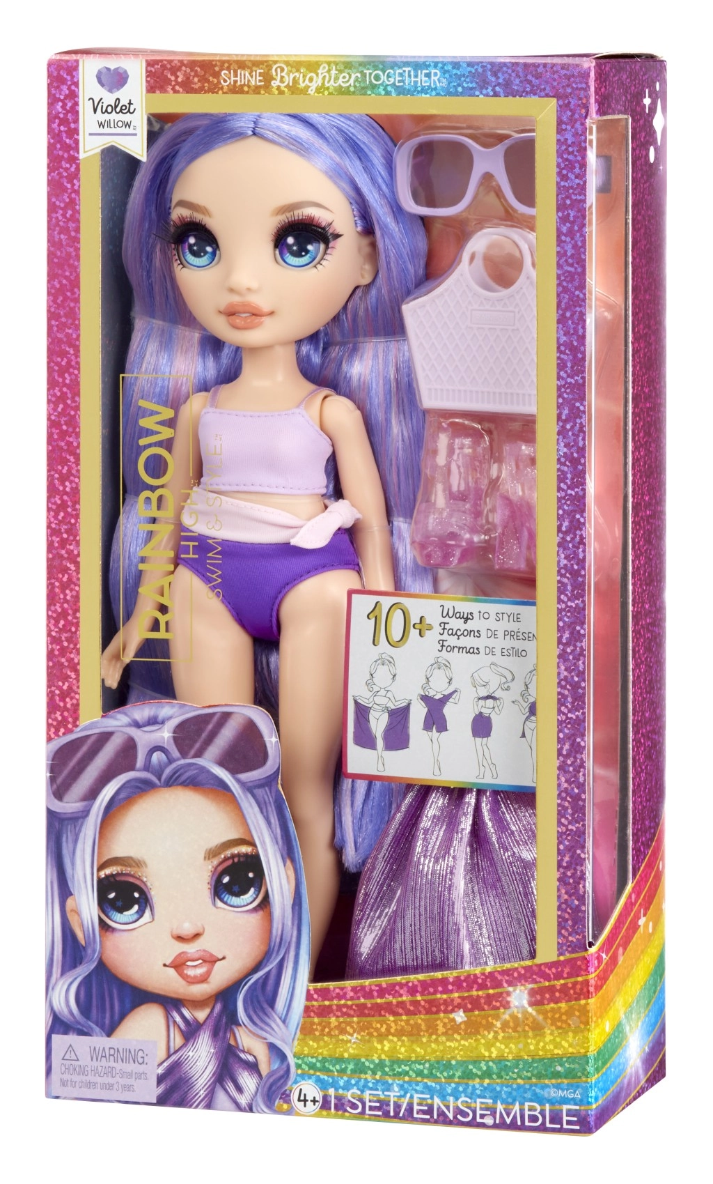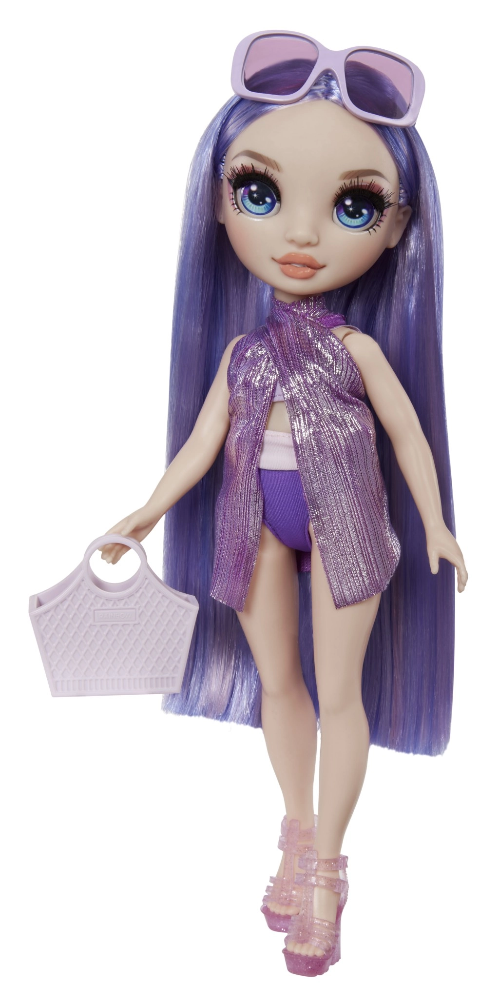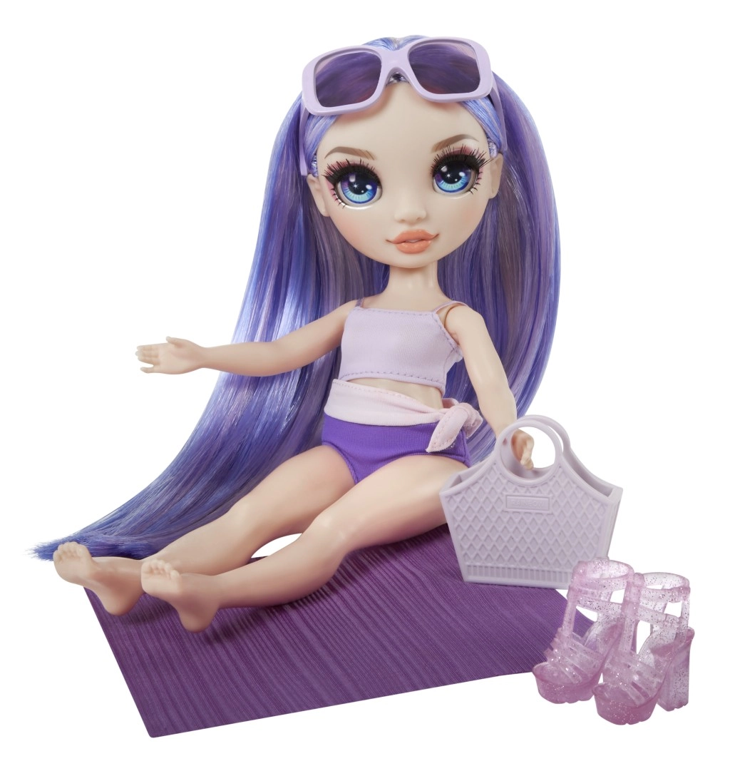 Куклата Rainbow High Плажен стил в лилав цвят е готова за летни приключения. Тя е облечена в прекрасен бански комплект и оборудвана с аксесоари, които подчертават нейния уникален стил. Колекцията Rainbow High Swim & Style предлага повече от 10 различни стилизации, които могат да се комбинират и събират.