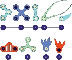 Многопосочни елементи с ротация 360° и фиксация в 24 позиции се държат стабилно заедно и позволяват изграждане на устойчиви 2D и 3D конструкции.