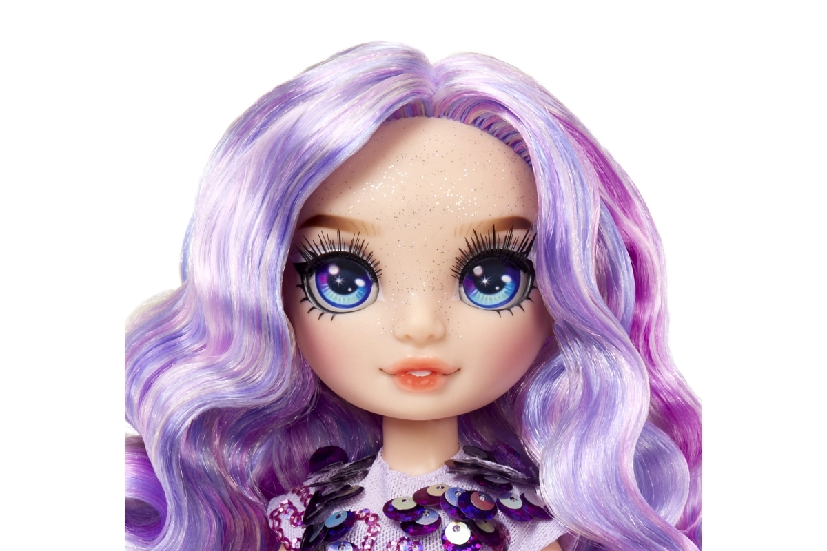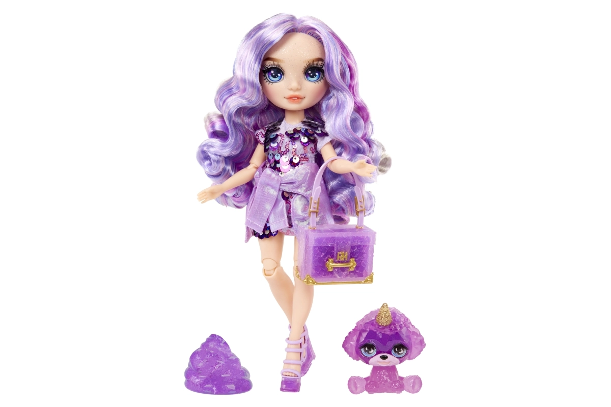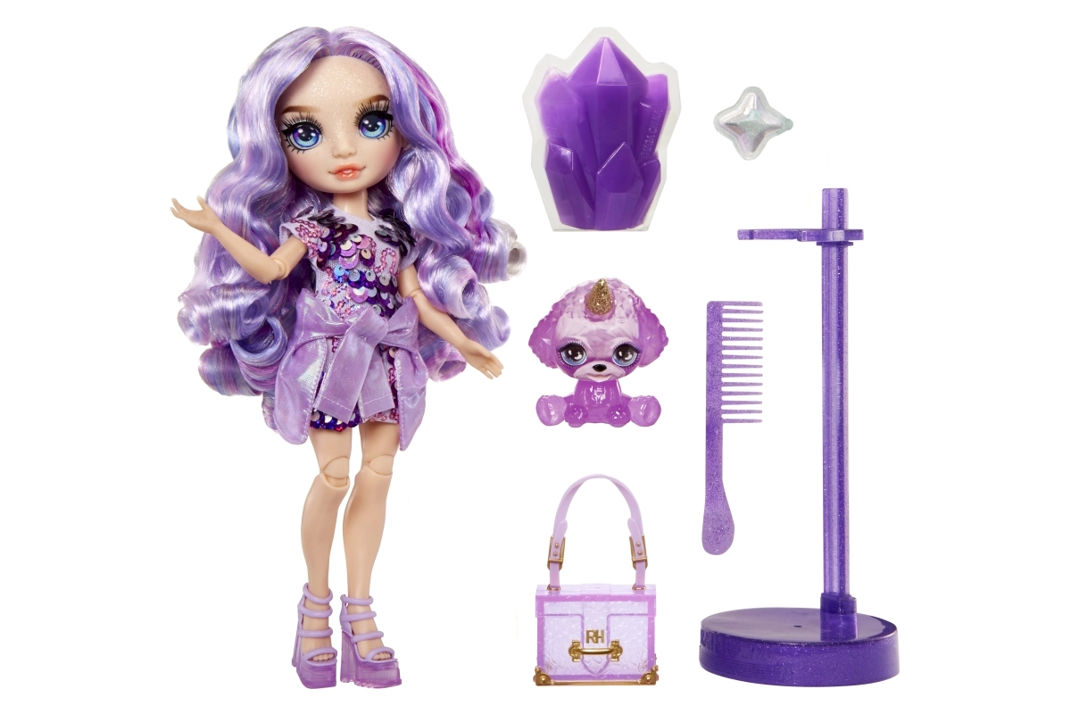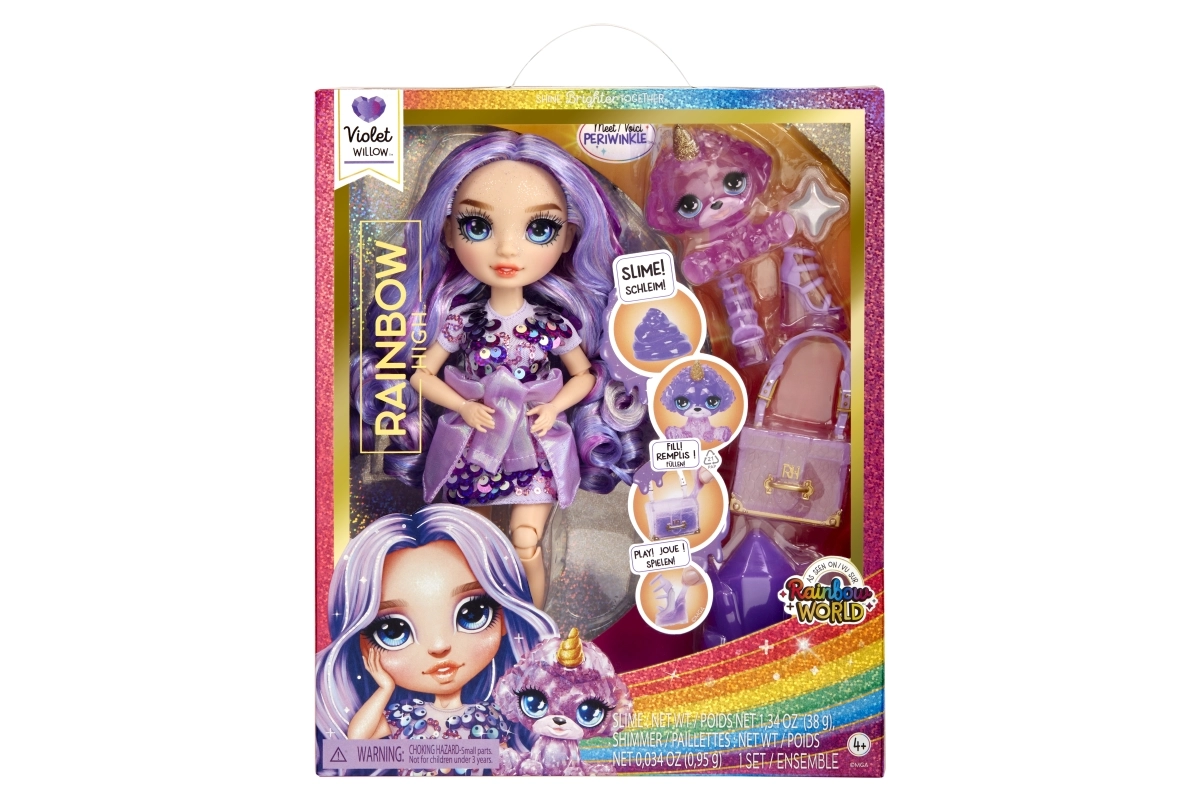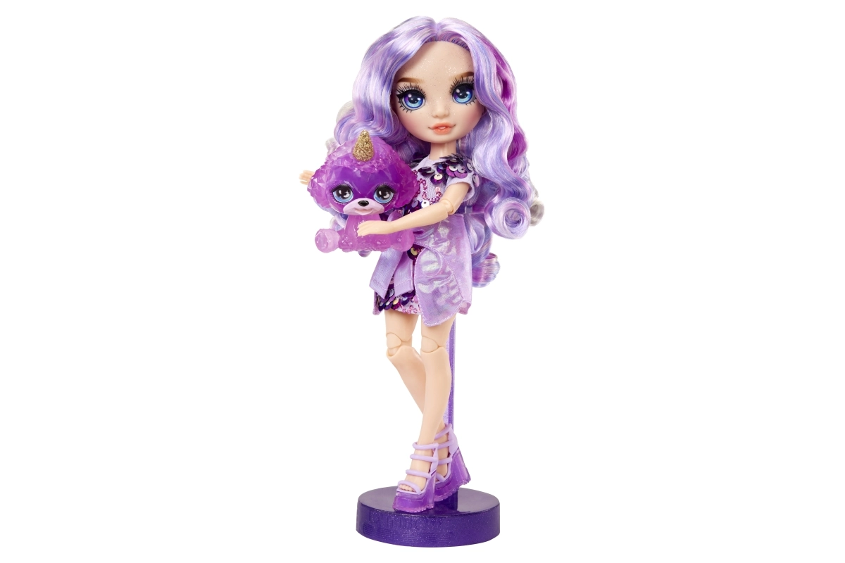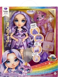 Открийте света на Rainbow High с куклата Violet, която предлага безкрайни възможности за игра и творчество. Куклата е гъвкава и нейните стави позволяват широки движения, което носи повече възможности за креативност. Всяка кукла има свой магически любимец, чийто цвят може да се променя с помощта на слуз. Куклата идва с уникални модни аксесоари, като сменяеми обувки и чанта, които могат да бъдат украсени със слуз. Освен това в комплекта има стойка, на която куклата може да бъде изложена, за да е винаги готова за игра.