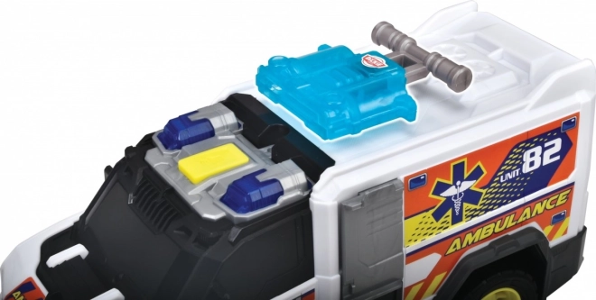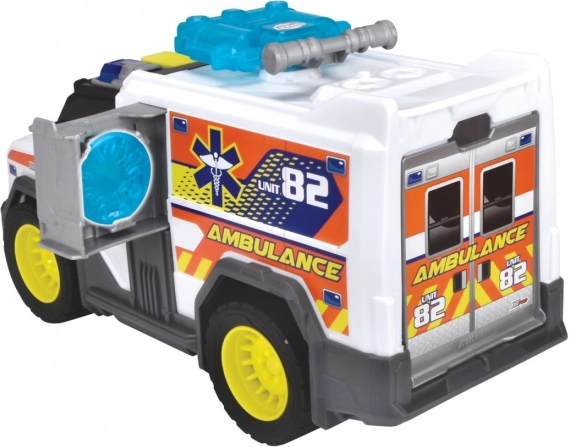 Задната част на линейката може да се отвори, което позволява лесно товарене и разтоварване на носилките и други играчки.