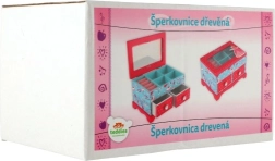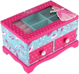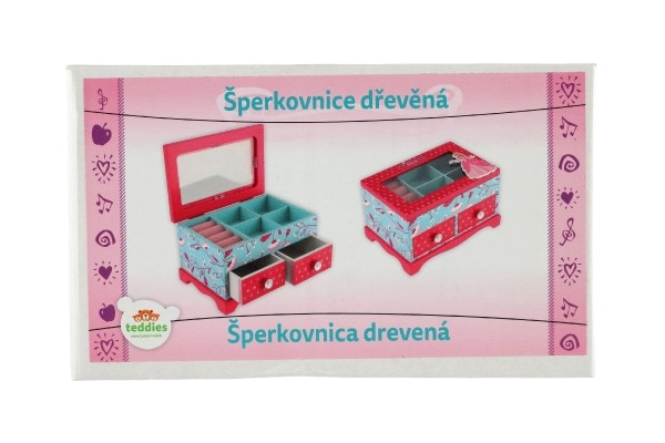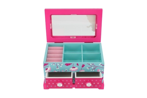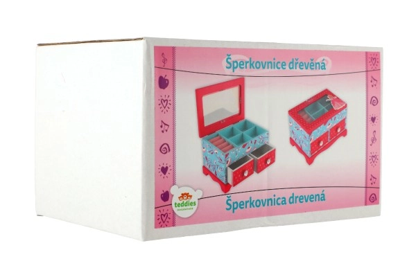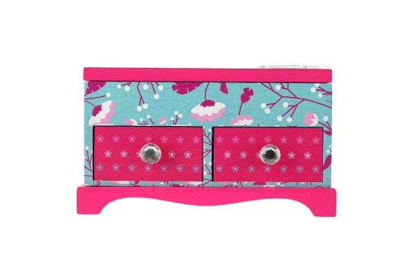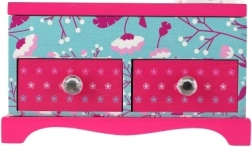 Повърхността на кутията е украсена с нежни флорални и птичи мотиви в розово и тюркоазено синьо, които прекрасно допълват всяка детска стая. Благодарение на здравата дървена изработка и удобните гладки дръжки, децата могат лесно да я използват. Не е играчка – подходяща е като декоративен и съхранителен предмет.