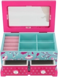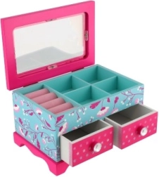 Горната част с огледалце и разделени отделения плюс две просторни чекмеджета държат бижутата и дреболиите подредени на мястото им.
