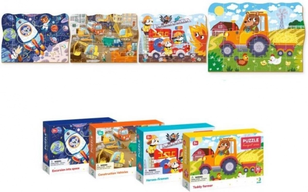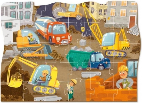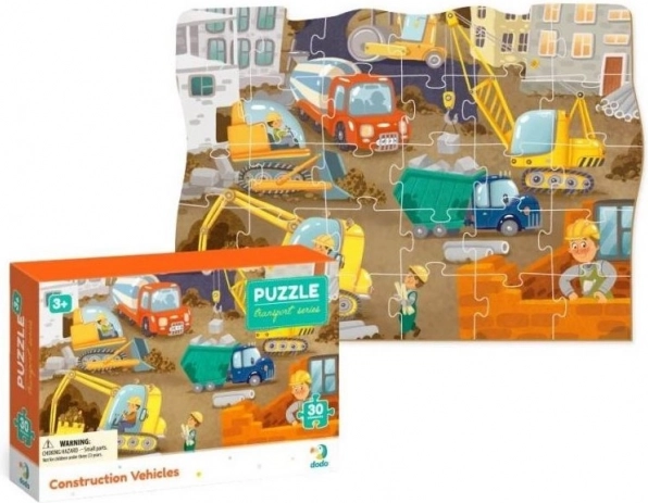 Серията пъзели ТРАНСПОРТ от марката DODO предлага прекрасни илюстрации на превозни средства. Този конкретен пъзел изобразява строителни машини и може да се свързва с други сцени, като ферма, космос или противопожарна спасителна служба.