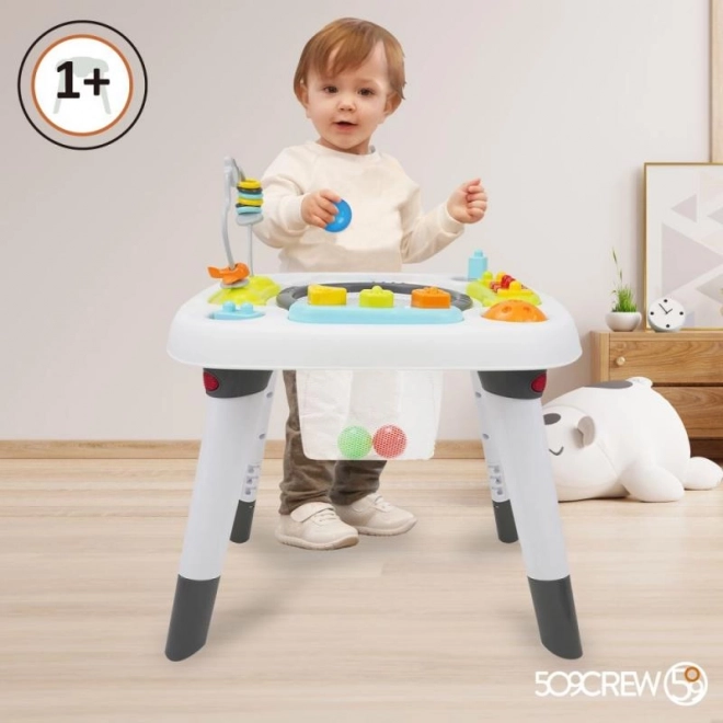 Интерактивната детска маса за игра 3 в 1 е повече от играчка. В първия етап детето може да изследва света около себе си от удобството на седалката с лесно достъпни играчки. Вторият етап носи забавление при прохождането и взаимодействието с интерактивни и цветни играчки, подредени около масата. Третият и последен етап превръща масата във функционална мебел, която може да служи за игра, хранене или други креативни дейности.