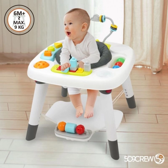Масата предлага три различни етапа за растеж и забавление на вашето дете – от седене, през прохождане, до креативни активности.