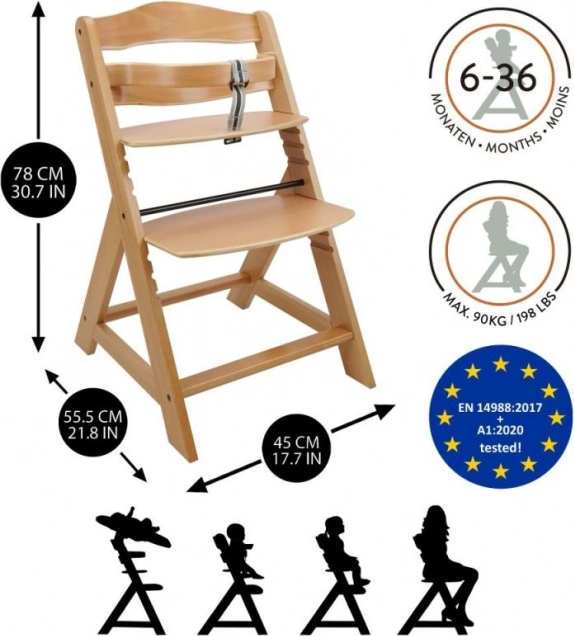 Дървеният растящ стол за хранене е проектиран за максимален комфорт и безопасност на деца от шестмесечна възраст. Оборудван е с многостепенно регулиране на височината на седалката и поставката за крака, така че може да служи от ранна възраст до зрялост. При достигане на по-голяма възраст предната преграда и разделителят в областта на чатала могат да бъдат свалени и столът да се превърне в обикновен стол. Изработен е от висококачествена немска букова дървесина и осигурява стабилност и елегантност. Максималното му натоварване е до 90 kg.