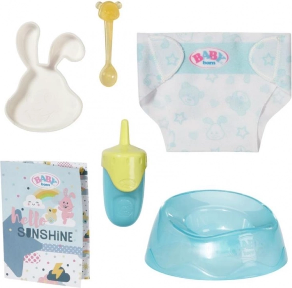 Комплектът включва шише, биберон, биберон с лента, пелени и други аксесоари за пълна грижа и игра.