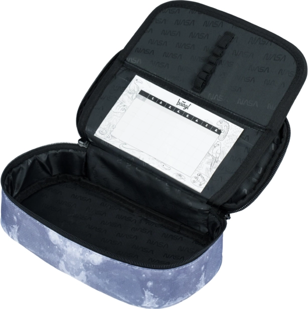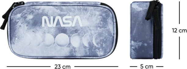 Несесерът тип етюи от рециклиран материал има отваряща се преграда, джоб с цип и отделение за разписание. Торбата с мотив NASA е от здрав, миещ се материал и благодарение на връзките може да се носи и на гръб. Целият комплект е проектиран за ежедневна натовареност и е тестван в акредитирана лаборатория.